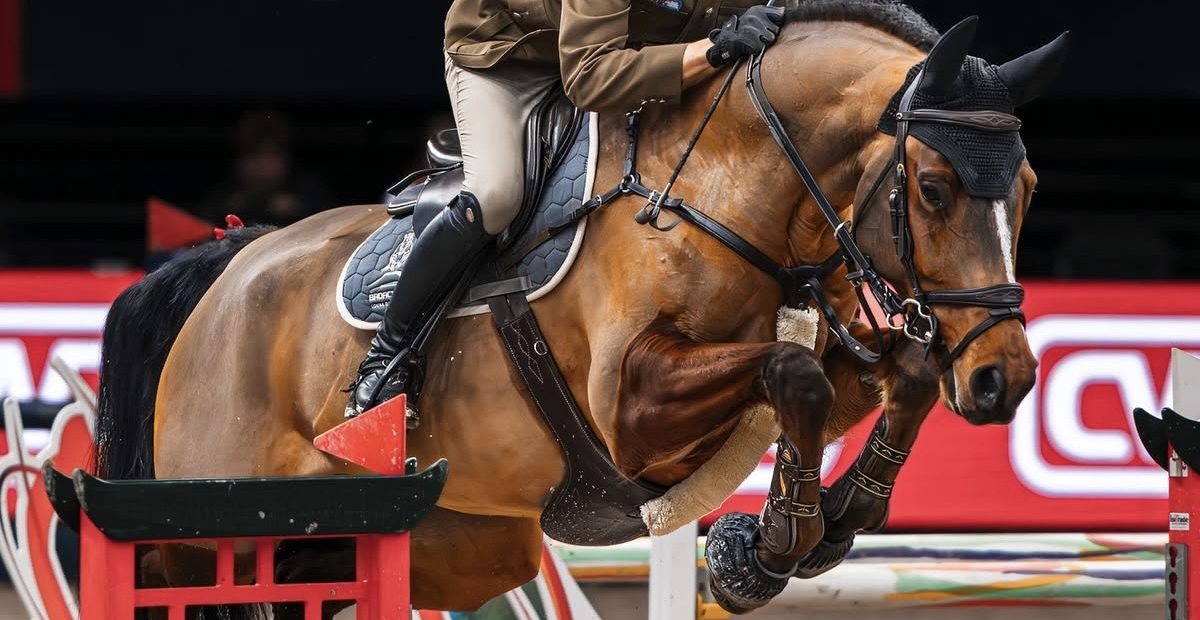 Mráz Tamás felnőtt díjugrató válogatottunk, a Lewitzi tenyésztésű, Viva Centtel a lipcsei ötcsillagos díjugrató versenyen,  több ezer néző...